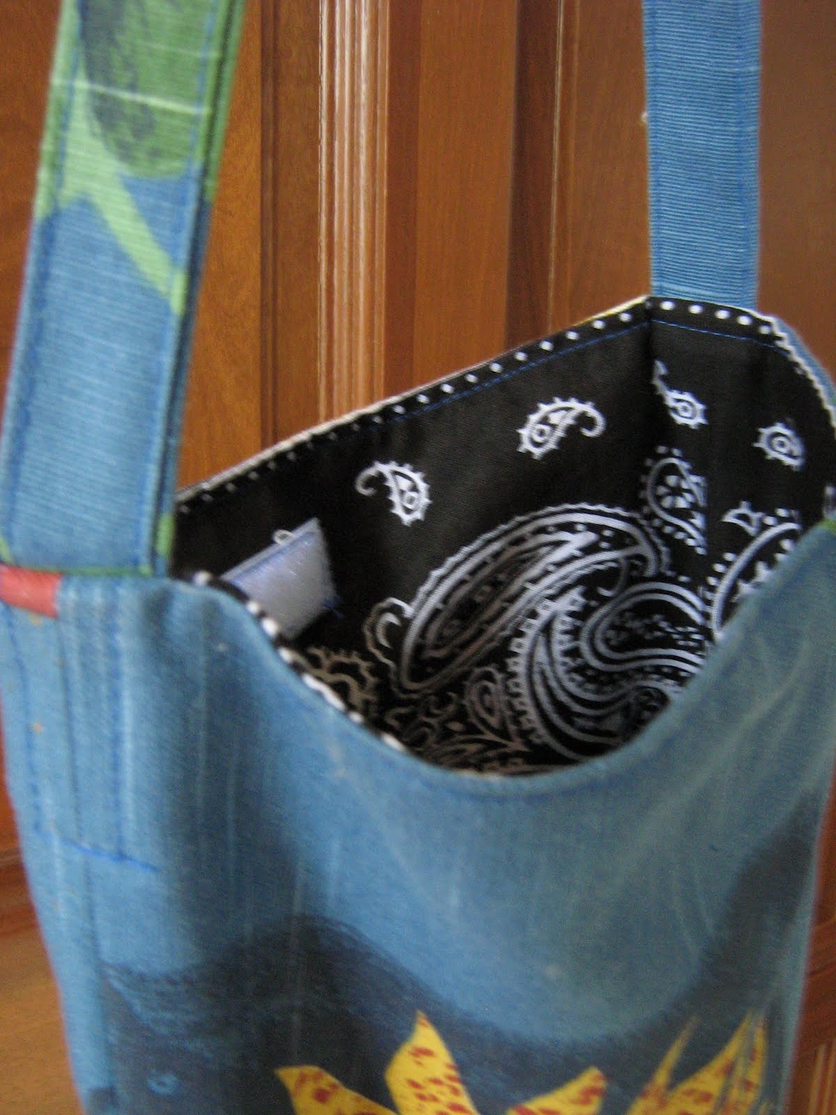 | 单肩的背包是新的尝试,因为平常双肩带的包常常会滑下一边,所以试试看。 布料都是免费的,是家具厂供应的样品,没想到它们的命运原来是要化身包包。 |